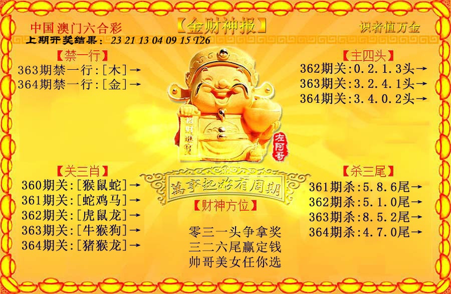 | 364期 | 虎蛇猴马牛狗 | 开:?00中 |